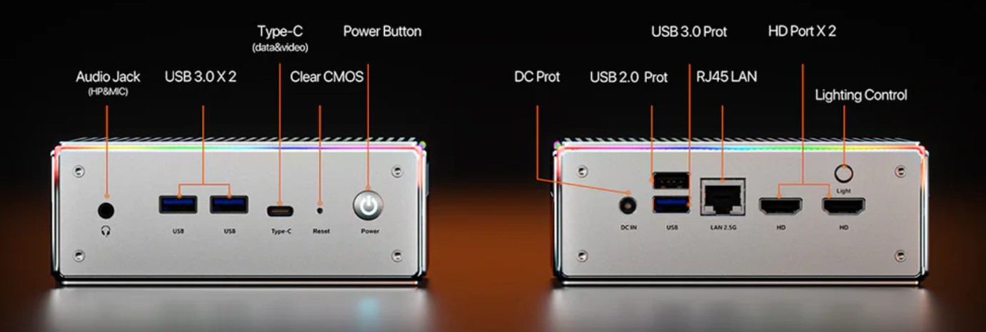 Der Peladn HA-4 präsentiert sich in einem hochwertigen Aluminiumgehäuse mit kompakten Abmessungen und einem Gewicht von 965 Gramm. Verglichen mit anderen Mini-PCs bringt der Peladn HA-4 spürbar mehr auf die Waage, was auf das Aluminiumgehäuse zurückzuführen ist. Außerdem spendiert der Hersteller dem Mini-PC eine dezente RGB-Beleuchtung. Positiv: Die Beleuchtungsmodi lassen sich manuell per Taster durchschalten, ohne eine spezielle Software nutzen zu müssen. Die Anschlüsse sind sinnvoll auf Vorder- und Rückseite verteilt und bieten eine solide Auswahl für den alltäglichen Office- und Multimedia-Einsatz. Auf modernste Schnittstellen wie USB4 oder OCuLink muss jedoch verzichtet werden, dennoch lassen sich bis zu drei Displays gleichzeitig betreiben. Ein weiteres Plus ist die Netzwerkausstattung mit einem 2,5-Gigabit-LAN sowie schnellem WLAN, wodurch der kompakte Mini-PC auch für anspruchsvollere Netzwerkaufgaben bestens gerüstet ist.